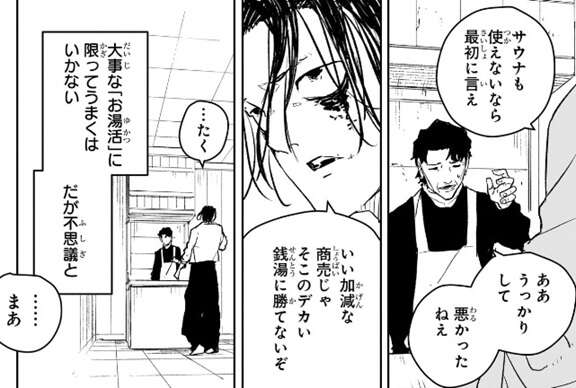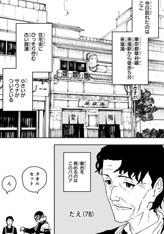 双城の行きつけの銭湯は来塩駅から徒歩5分の所にある、来塩湯だそうです。番台を務めるのは、このたえというこのお婆さんです。すぐ近くに風呂とサウナの両方がデカい施設が出来たそうで、興味もあるようですが双城は刺青があるからそちらには入れないそうです。