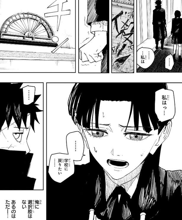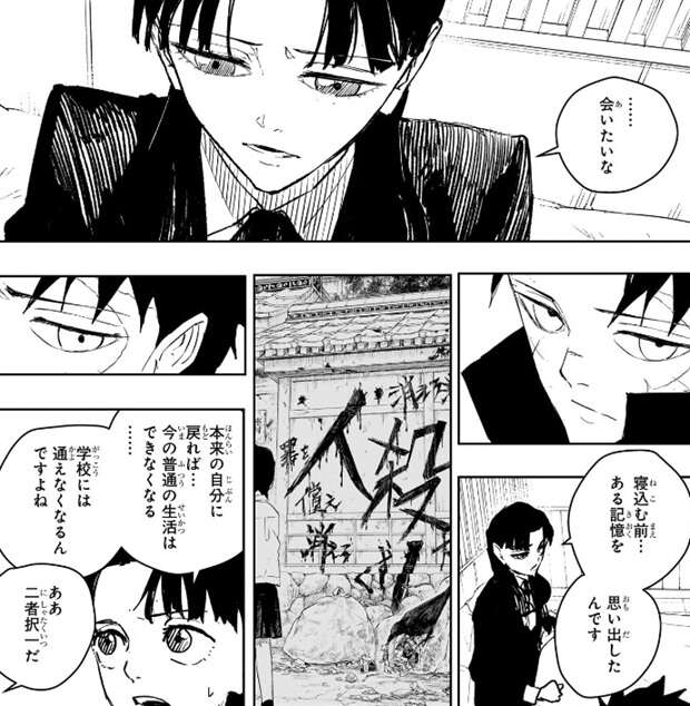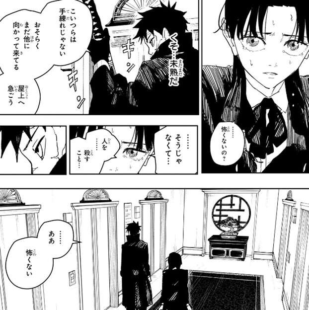 たくさんの死体に恐怖したイヲリは、チヒロに怖くないのか質問します。男達は手練れじゃない、おそらくまだ他に向かって来ているから屋上へ急ごう、とチヒロは答えますが、戦う事ではなく人を殺す事が怖くないのか、とイヲリは聞き直します。チヒロは、ああ…怖くない、俺はイヲリとは違いもうこの生き方しかできない、と答えます。そして、座村の娘として生きる生き方、上塗りされた平凡な生き方、どちらも真実でどうすべきかなんて正解はない、イヲリがどうしたいかだ、とチヒロは言います。