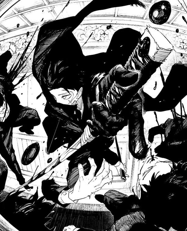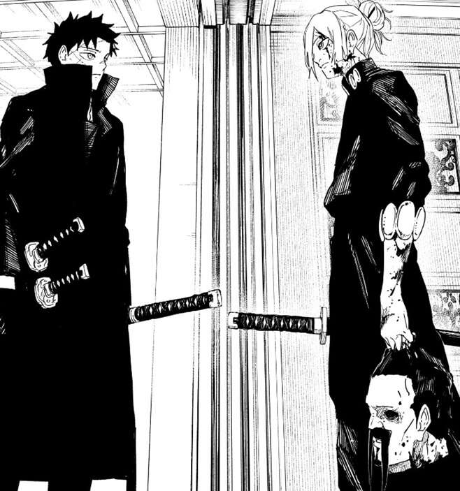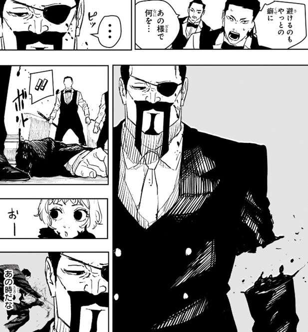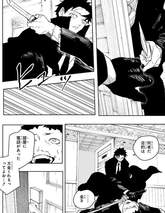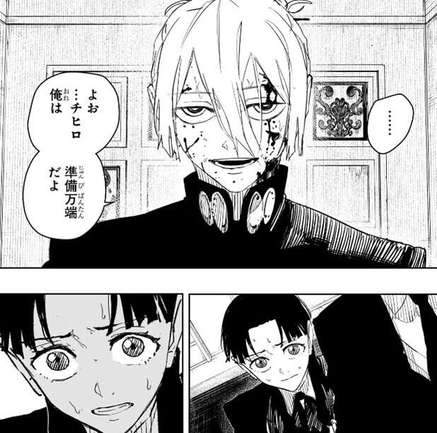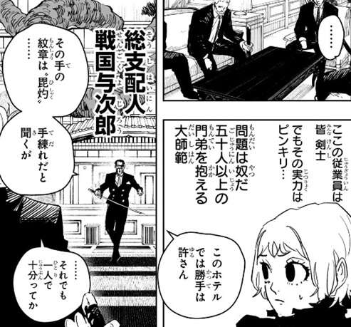 京都殺戮ホテルの従業員は全員が剣士で、実力はピンキリのようです。しかし、礼玄一刀流・免許皆伝で大師範の戦国与次郎は別格のようで、戦国与次郎は他の従業員に手を出させず一人で昼彦と斬り合います。斗斗は、昼彦は妖術師の中ではかなり上澄みではあるが、妖術ありきで剣術を碌にやったことがなく、さらに酌揺と命滅契約を結んで自分の妖術を失った昼彦には戦国与次郎の相手は厳しいと分析します。しかし斗斗は、怖いからじっとしとこ、と心の中でつぶやきます。