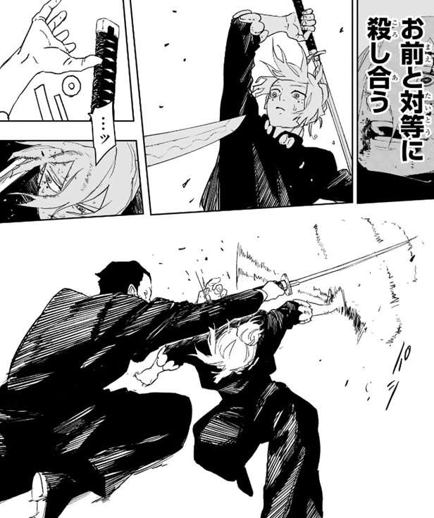 実際に昼彦は戦国与次郎の刀を受けますが、戦国与次郎の刀を受けきれず刀を跳ね返されてしまいます。昼彦は久々李から剣術の“型”の重要性について言われた時の事を思い出し、このままでは妖刀を握っても千鉱と同じ土俵に立っているとは言えないと感じます。それでも千鉱と対等に殺し合うと言った時の事を思い出すと、昼彦は刀を一度手放し再度、刀を握り直すと変則的な太刀筋で戦国与次郎を攻撃します。