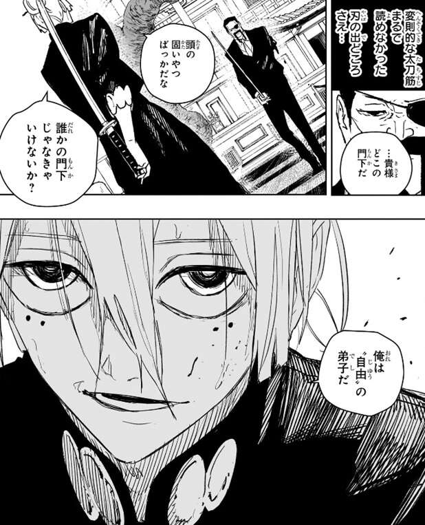 刃の出どころすら見えなかった戦国与次郎は、昼彦にどこの門下だ、と質問します。しかし昼彦は、頭の固い奴ばっかだな、誰かの門下じゃなきゃいけないか?と言うと、俺は“自由”の門下だ、と言い、昼彦は剣術を誰かに教わるのではなくあくまで自己流でやるようです。