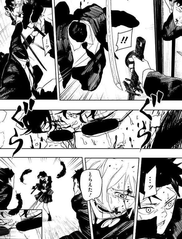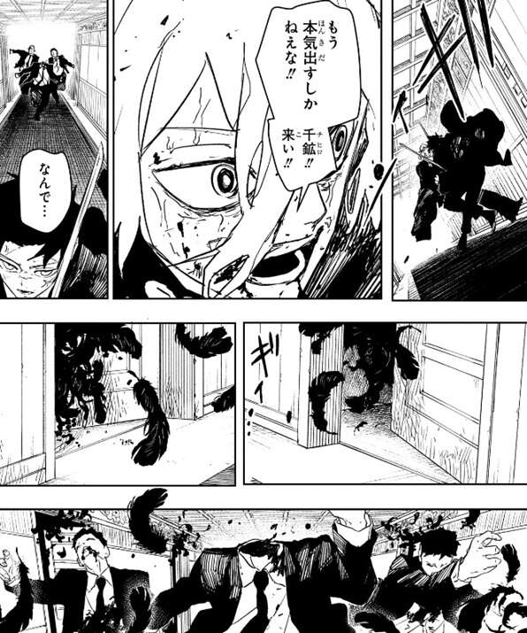 昼彦はチヒロに斬りかかりながら、もう本気出すしかねえな!!千鉱!!来い!!と、チヒロに本気を出すように迫りますが、…なぜそこまであの剣豪(ひと)を…侮れる…!!と、昼彦に答えます。一方、チヒロの後ろからは大量の黒い羽根が、チヒロと昼彦の方に迫ってきていました。