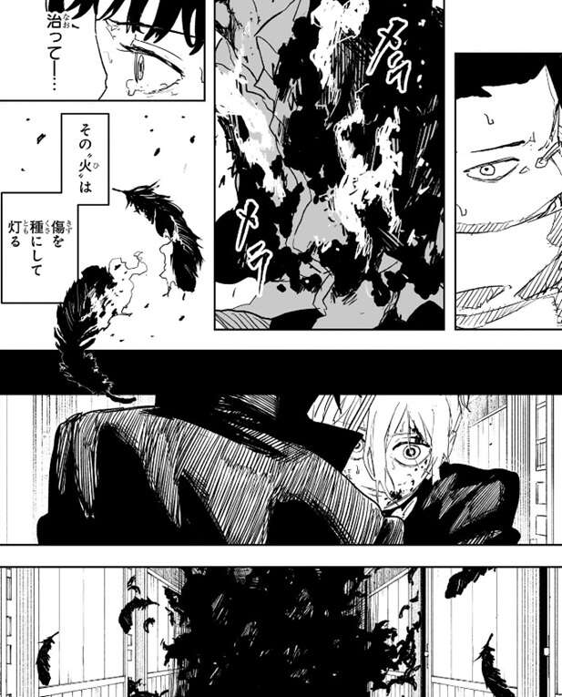 雀を使用すると体の傷の場所に火がつき、傷が治っていきます。その“火”は傷を種(くさ)にして灯るようですが、傷が治る以外の能力の詳細は現時点では不明です。チヒロと昼彦の場所には大量の黒い羽根が迫ってきますが、その大量の黒い羽根の中に座村がいて、活気がいいなぁ糞餓鬼、と昼彦に話しかけます。
