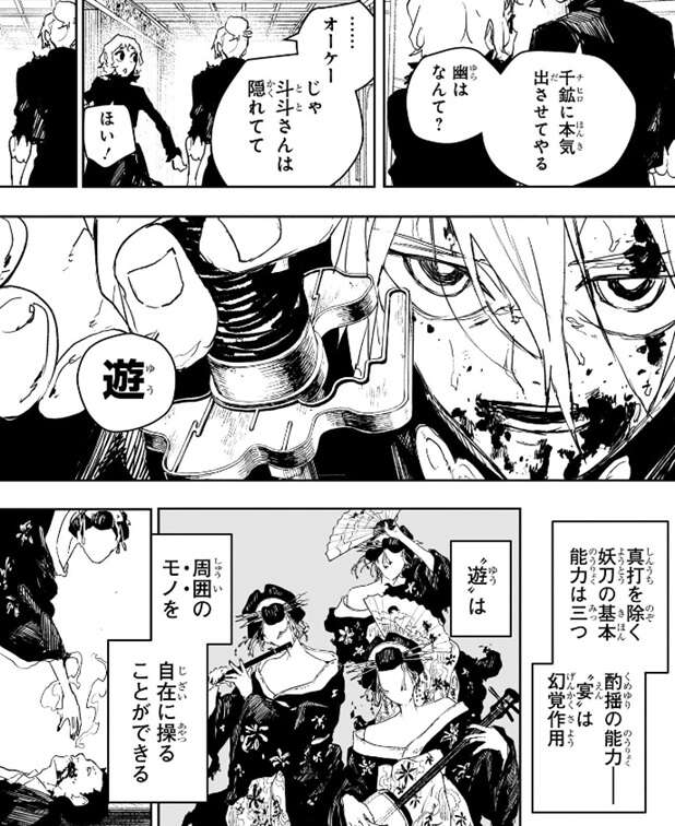 自分に対して本気を出さないチヒロに対して、本気を出させようと昼彦は先に座村を殺していやると言い出します。斗斗から飛宗は絶対回収するよう指示されると、昼彦は斗斗に隠れるように言い、酌揺の能力『遊』を使用します。真打を除く妖刀の基本能力は三つで、酌揺の能力は宴の幻覚作用、そして遊は周囲のモノを自在に操ることが出来るそうです。昼彦が遊を使用すると、死んだはずの京都殺戮ホテルの宿泊客が動き出します。