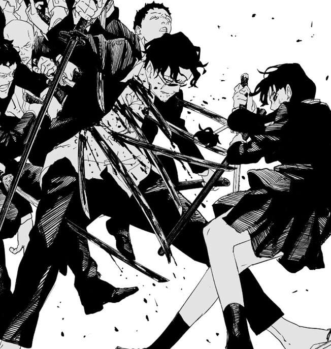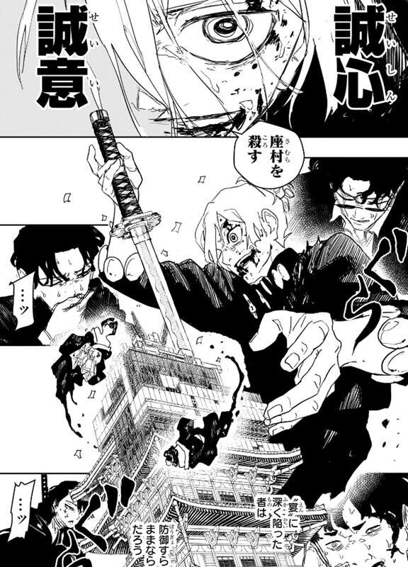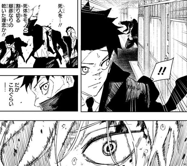 冒頭、妖刀には理論を越えた“本領”があり、理論的な際限は持ち主に依って幾らでも変貌し得る、という説明が入ります。そして場面はチヒロと昼彦の戦いに移りますが、チヒロが錦を三半規管の補強のみに使い、“宴”の対策として運用しているだけの状況を見て、チヒロの本命は座村で自分を殺すには力を温存している事に昼彦は苛立ちます。