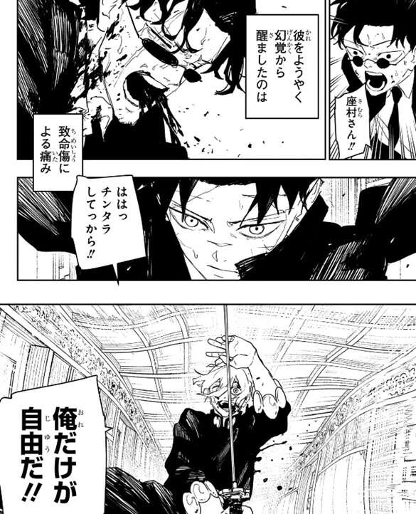 そして場面は座村が何本もの刀に貫かれた直後に戻りますが、刀に貫かれた直後操られていた死体が消えたように見えます。傷だらけの座村ですがイヲリに、傷つくのァ…俺だけでいい、と言うと飛宗の能力『雀(すざく)』を使用します。