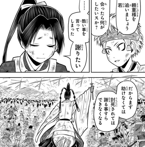 諏訪頼重は、諏訪家全体に乱の責任を負わせないように、死を覚悟で足利尊氏に最後の戦いを挑みに行きます。時行は泰家から諫められ頼重の立場を理解し、酷い事を言ってしまったと悔やみます。時行は頼重に謝ろうと、まずは頼重を戦場から救出しようとします。