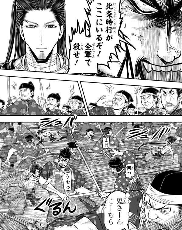 辻堂の戦いで頼重は尊氏に敗れ、討ち取られる寸前でしたがそこに時行が乱入してきて、足利軍に鬼ごっこを仕掛けます。時行は鈴を鳴らしながら足利軍の隙間を逃げ続けます。足利軍が時行を殺そうと躍起になっている間に、頼重を時行の兵が救出します。頼重達を救出している間、時行は足利軍の注目を集めながら逃げ続けます。