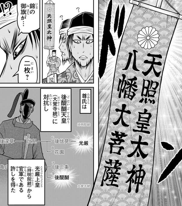13巻では、中先代の乱に敗れた時行はやっとの思いで奪取した鎌倉から逃げて、伊豆へと潜伏します。尊氏は後醍醐天皇と決裂し、京まであと少しの所まで迫りますが奥州から駆け付けた公家の北畠顕家によって撤退に追い込まれます。しかし、今度は九州で大勝利を収めて尊氏は西国武士を服属し、再び京へと迫ります。楠木正成を破り、新田軍を撤退させると京を占領し北朝を構えます。後醍醐天皇は吉野に逃げますが、未だ正当な帝であるとして朝廷を構えて南朝となり、ここに南北朝時代が到来します。そして、時行は南朝の後醍醐天皇に密書を出し、後醍醐天皇に頭を下げて南朝に味方に加えて欲しいとお願いします。時行は親の仇の後醍醐天皇(南朝)の下についてでも、尊氏に挑戦するつもりですが、再び尊氏に戦いを挑むことは出来るでしょうか?
