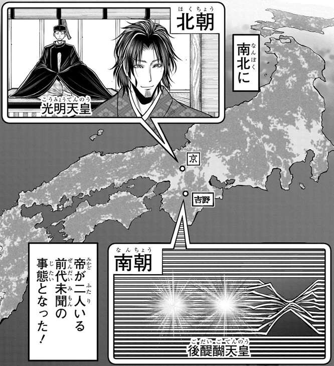 楠木正成を一騎打ちで討ち取った尊氏は足利軍を率いて、そのまま京へとなだれ込みます。さらに帝派勢力を京の周囲から一掃するため、地方からも足利派勢力が集結し新田軍は京から撤退、後醍醐天皇は尊氏に降伏します。しかし、強引に帝の位を譲らされた後醍醐天皇は南に100キロ、守りの堅い山里の吉野に逃げて南朝を構え、日本は南北に帝が二人いる前代未聞の時代となってしまいます。