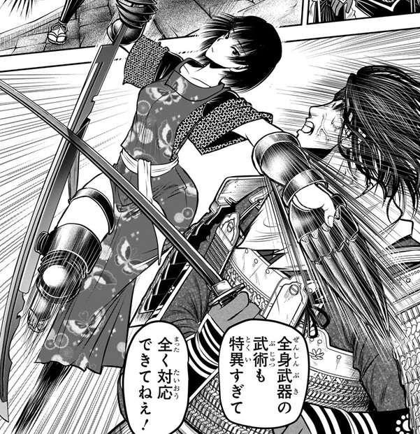 弧次郎が長尾に一蹴されて、時行が殺されそうになった時、時行を救ったのは12巻 第99話で出会ったシイナでした。シイナは正宗に作ってもらった脚の刀で、長尾と互角以上の戦いをします。長尾はシイナの全身武器の武術に全く対応できず押されますが、シイナの武器は破壊力が強すぎて疲労が激しく、すぐにバテてしまいます。