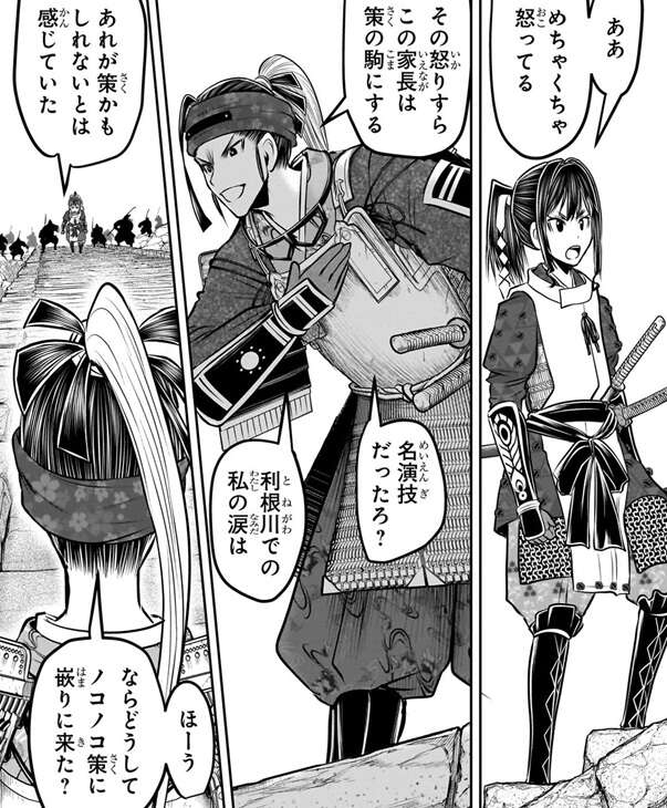 時行は北条郎党の思いや宿命を意識すると、鬼丸が急に軽くなり家長との一騎打ちを有利に進められるようになります。そして有利な階段の上側を取ることに成功しますが、有利な状況になったはずの時行は家長から逃げて自ら足利軍の方へと走っていきます。そして、足利軍に横槍を入れてくるように自ら挑発します。時行の挑発に足利軍の兵士は困惑しますが、家長は時行の狙いを読んでいました。