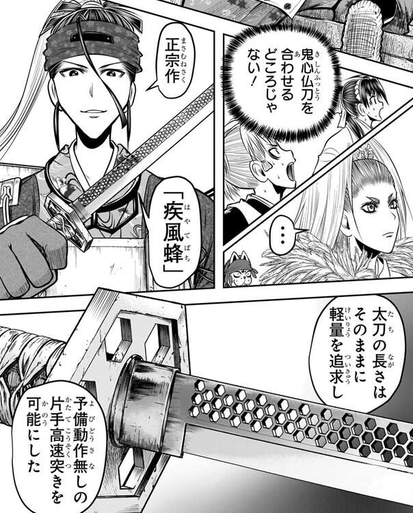 顕家の計らいで時行と家長は一騎打ちをすることになりますが、家長は有利な階段の上側を取り、一騎打ちを有利に進めます。また、家長は逃げ上手の時行対策として、正宗作の「疾風蜂」という太刀を用意していました。この太刀は長さをそのままに軽量を追及していて、予備動作無しの片手高速突きが可能となり、空いた片手は防御に専念できます。この太刀と防御で家長は隙の無い武術を実現し、時行は得意の逃げ上手を使えず一方的に追い詰められていきます。