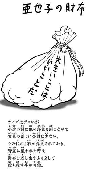第11話で玄蕃が亜也子から盗んだ財布ですが、袋が大きい割に額は他の郎党と同じだそうです。たくさん入っているように見えるのは石が混入されているからで、亜也子は野盗に襲われた時この財布を差し出すふりをして殴り殺すそうです。恐ろしい…。