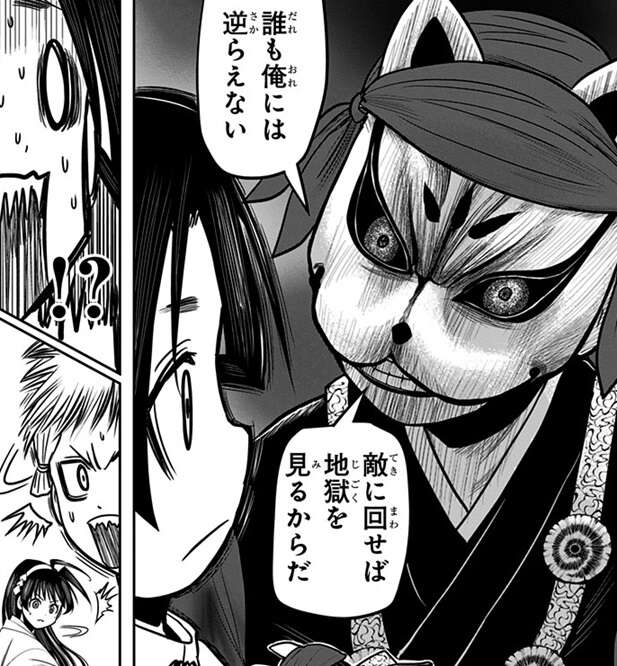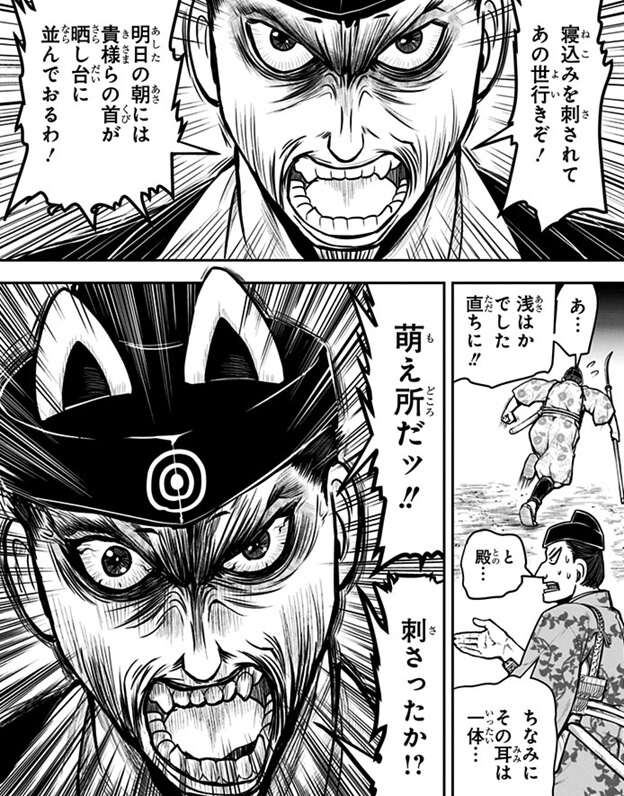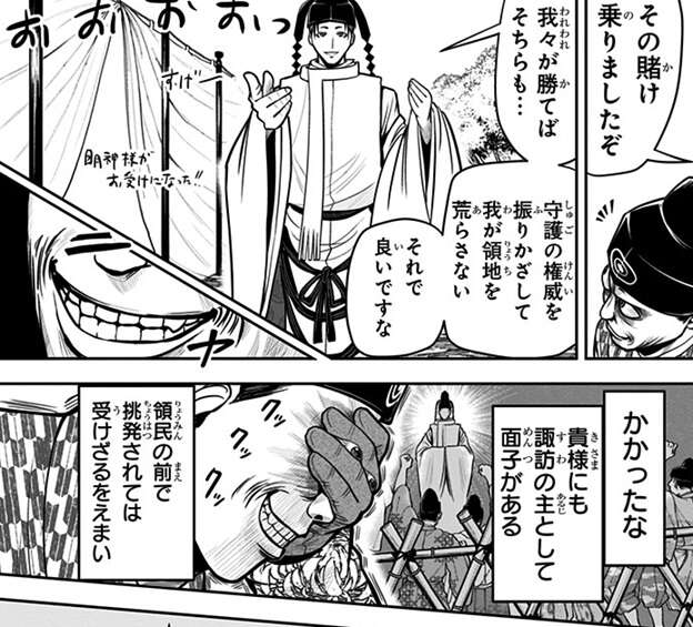 2巻では、信濃守護の小笠原貞宗が諏訪大社の催し「犬追物」に強引に乱入し、一対一の弓矢勝負を仕掛けてきます。時行が弓矢勝負を引き受ける事になり、その勝負の中で後方への射撃技「押し捻り」を編み出し、見事逆転勝利を収めます。また、その後の綸旨を巡る騒動の中で、風間玄蕃が逃若党の仲間に加わります。