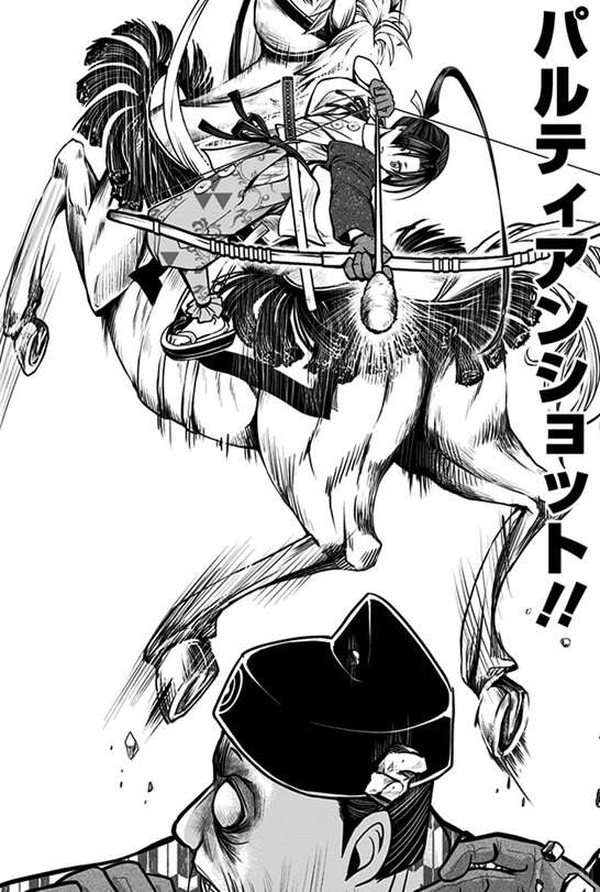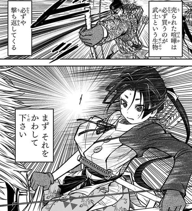 逆転され追い詰められた時行ですが、逆に楽しいと感じて馬上で笑顔を見せます。その後、頼重のアドバイスもあり、時行は逃げながら後方の相手を狙う射撃技「押し捻り」を編み出し、貞宗の首と頭に弓矢を射当てて見事、逆転勝利を収めます。