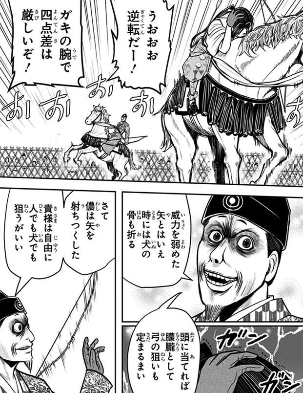 北条時行と貞宗の「犬追物」による一対一の弓勝負が始まります。最初、貞宗は時行を「長寿丸」と言う名前のただの子供だと思い、時行を侮り、時行に矢を直接当てて完膚なきまでに射ちのめそうとします。一方、時行は当てやすい赤犬に矢を当てて得点を稼ぐと、その後は逃げに徹して貞宗の焦りを誘います。