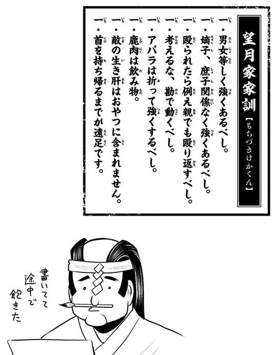 望月家の家訓、怪力の持ち主の重信・亜也子の家らしい家訓です。が、しかし「一・アバラは折って強くするべし」辺りから、過激で豪快な家訓になっています。「敵の生き胆」って書いてありますが…、食べるんでしょうか…?