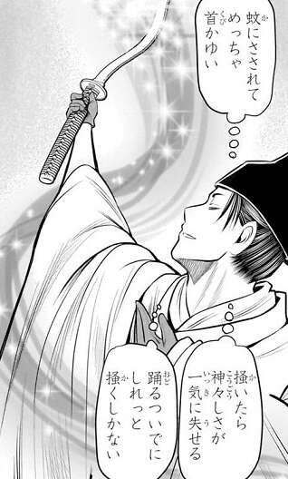 第66話で神々しい剣舞を披露し味方を鼓舞した頼重ですが、剣舞を待っている時の頼重はかなりどうでもいい事を考えていました。蚊にさされて痒い所を、踊るついでにしれっと掻いていたようです。