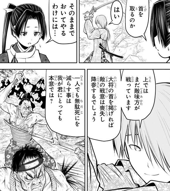 鎧、二刀、脚、フェイント、眼などあらゆる技術で北条時行と吹雪の攻撃を封じる将監に、北条時行には付け入る隙がありませんでした。そこで北条ときゆき は吹雪が考えた必殺技・二牙百刃で、将監の隙を作りつつ北条時行は将監の喉を突き刺し将監に致命傷を負わせます。将監は最後に自分が治めている村の子供の言葉を思い出しながら、ああ、死にたくない、と心残りを感じつつ絶命します。