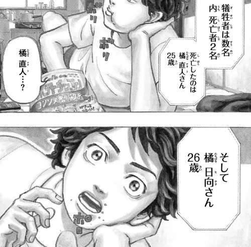 過去でカツアゲされている橘 直人を偶然助けたことで、現代の直人は生き永らえてさらに電車のホームへと突き落とされた武道を助けます。さらに直人は武道がタイムリープを出来ることを伝えると、2017年7月1日に姉のヒナが東京卍會(東卍)との抗争に巻き込まれて死亡する事を告げて、タイムリープをしてヒナを助けて欲しいと武道に頼みます。