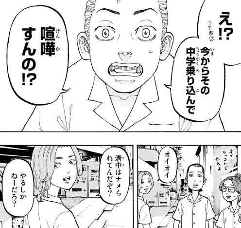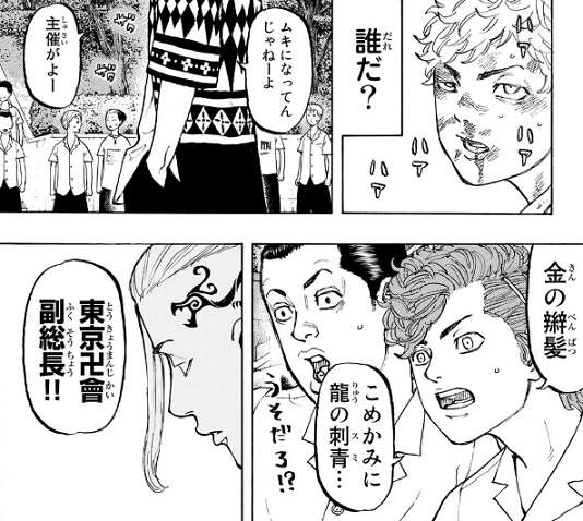 東京卍會のトップ、佐野 万次郎に会うには、このままキヨマサ達の奴隷ではいけないと、武道はキヨマサとタイマンを望みます。しかし、キヨマサにボコボコにされ半殺しにされますが、武道はそれでも引かずバットでボコられそうになります。そこに、東京卍會の副総長、ドラケンこと龍宮寺 堅と、トップの佐野 万次郎が現れます。
