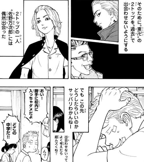 東京卍會に無断で喧嘩賭博をやっていたキヨマサは佐野 万次郎こと、マイキーに蹴り一発で沈められます。一方、マイキーに一方的に気に入られた武道は、またネ、と言われ何故気に入られたのか混乱します。マイキーに出会えたものの、どうやって東京卍會の2トップを過去で出会わせないようにすればいいか武道が悩んでいると、マイキーとドラケンが武道の学校にいきなり乗り込んできます。