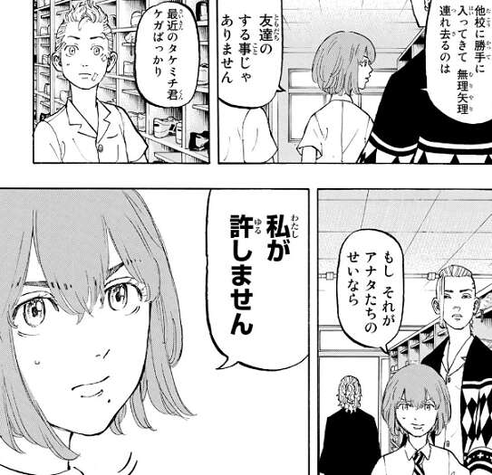 突然学校乗り込み武道を連れて行こうとしたマイキーを悪い友人と思い込み、ヒナは思いっきりビンタをしてしまいます。ドラケンから凄まれて、マイキーからは殴られそうになる武道ですが、その後ヒナの勘違いだと分かってもらえ、ヒナとマイキー、ドラケンは仲直りします。