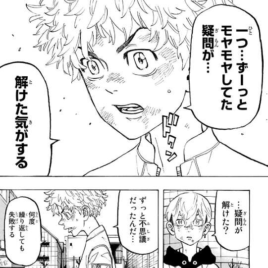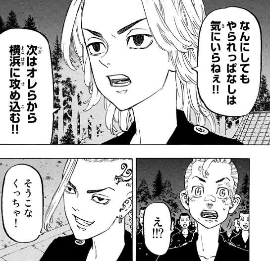 横浜“天竺”に逆に乗り込みに向かった武道達は、肆番隊の隊長&副隊長の河田ナホヤとソウヤが天竺のモッチーこと望月莞爾と因縁があり、完敗していた過去がある事を知らされます。しかし、ナホヤとソウヤは完敗した過去を気にすることなく、横浜“天竺”に乗り込もうとします。一方、武道は稀咲もタイムリープを繰り返している可能性に気付きます。