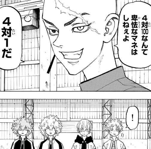 天竺のアジトに乗り込んだ武道達ですが、そこには“天竺”四天王の鶴蝶他、100人が待ち構えていました。罠と思われましたが、鶴蝶は他の100人に出ていくように命令し、武道、河田兄弟、千冬に4対1の勝負を持ちかけます。