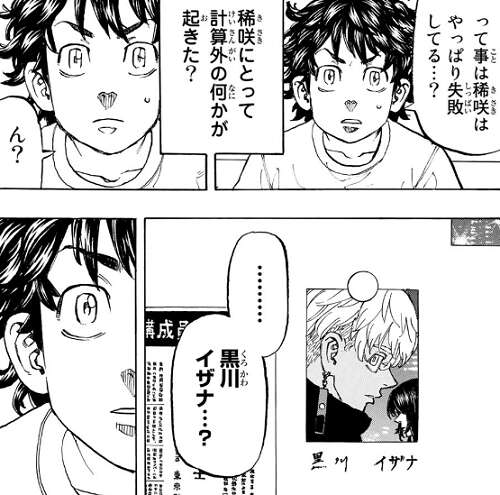 現代に戻った武道は過去で新しく知った事、稀咲がタイムリーパーではとの考えを、直人に話します。直人から稀咲が本当にタイムリーパーなら今、過去で何を狙っているか話したいた時、武道はナオトの資料から天竺総長 黒川イザナが、現代で東卍幹部の一人になっている事を見つけます。