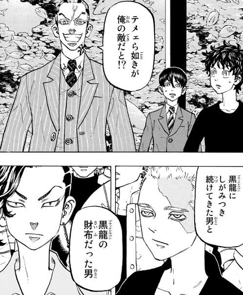 教会で偶然にも大寿と出会った武道は、直人と一緒に黒川イザナと「黒龍」について教えてもらいます。大寿が経営している飲食店で黒川イザナと「黒龍」について教えてもらい、「黒龍」の成り立ちや、稀咲は死んでおらず黒川イザナが死んだように偽装してた事を知らされます。