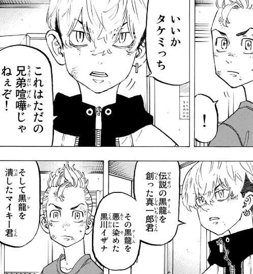 黒川イザナがマイキーを狙うのは、マイキーを恨んでの私怨だったことを知った武道は、千冬に全てを話して、一人で稀咲と黒川イザナを殺す決意をします。自分個人の戦いのため、壱番隊の皆は巻き込まないと決めますが、千冬は納得せず武道自身の言葉で一番隊に説明するように言います。