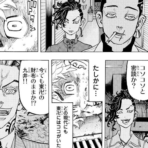 ムーチョが天竺創設メンバーであり、黒川イザナの命令でココを天竺に入れさせる事が狙いだと武道は知らされます。そして武道と乾はココを天竺に入れるための人質として拉致された事、黒川イザナの狙いはココの“財力”、稀咲の“ブレーン”、マイキーの“カリスマ性”を集める事だと、武道達はムーチョから知らされます。