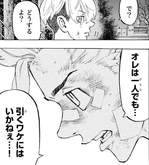 エマの死が受け入れられないマイキーとドラケンは天竺の抗争にも参加できず、東卍は天竺に乗り込めずにいます。一方、武道はマイキーにエマを殺したのは稀咲である事を伝え、自分一人でも天竺とやると宣言し、自分だけでも前に進もうとします。