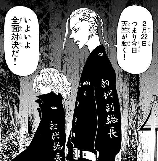 乾は聖夜決戦の翌日に、マイキーに武道を黒龍の十一代目総長に指名する事を伝えます。大寿に立ち向かう武道に、初代総長 佐野真一郎の面影を見て黒龍総長の器と感じた、と告白します。そして、マイキーに天竺が本腰を入れて攻めてくるなら、初代黒龍が誕生した明日2月22日だと伝えると、マイキーは東卍最後の決起集会を開きます。
