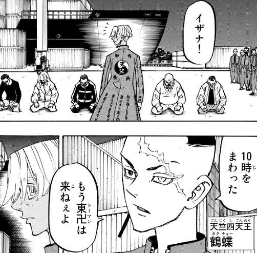 横浜第7埠頭で東卍を待つ天竺ですが、既に10時を回り東卍は抗争にはもう来ない、と鶴蝶はイザナに伝えます。三ツ谷とスマイリーは班目と竜胆が、壱番隊はムーチョが潰し、そしてマイキーとドラケンはエマの死によって戦意喪失した事により、東卍は何もできないと天竺のメンバーから思われていました。