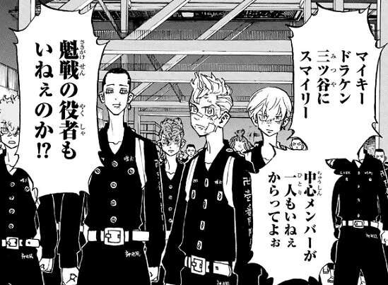 5年前の回想として、イザナと極悪の世代は少年院で出会っていました。その時、いつかみんなで集まろう、その時まで……、もっと極悪(きわめ)ろ、とイザナは極悪の世代に言います。そして、再び東卍と天竺の抗争の場面に戻り、天竺四天王 望月は千冬と、灰谷蘭は八戒と、竜胆は河田ソウヤと、鶴蝶は武道とそれぞれ対峙します。