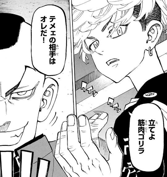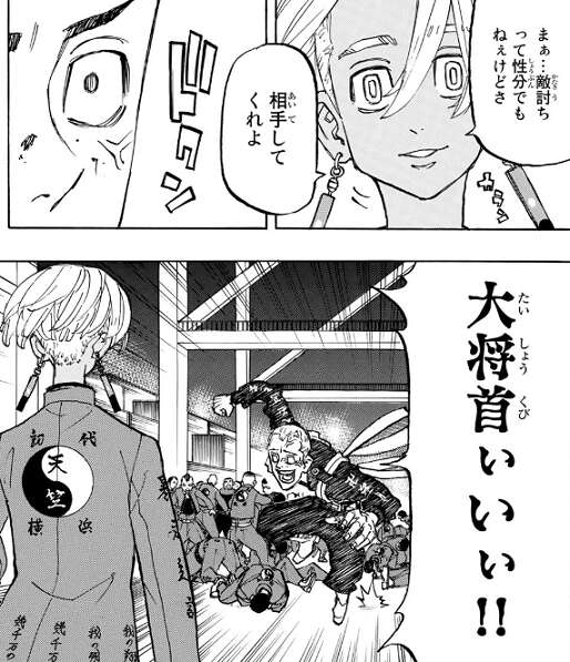 武道を総長代理として天竺との抗争に現れた東卍ですが、天竺400人に対して東卍は50人と圧倒的に数の上では不利です。天竺はまずは班目がタイマン戦を申し出てきて、東卍側はぺーやんが名乗り出ます。マイキー達主力メンバーが不在で、東卍側が不利と思われましたが、ぺーやんがパンチ一発で班目を倒し東卍の士気を上げます。