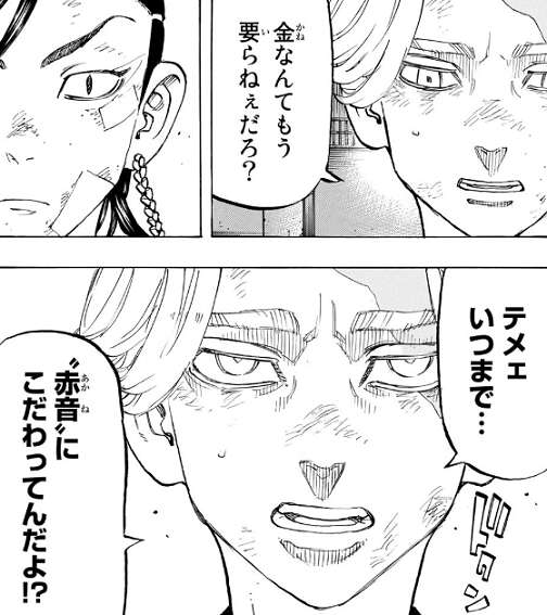 乾と対峙したのは、ムーチョに拉致されやむなく天竺に入ったはずのココでした。天竺側のふりをしなくてもいい、オマエを迎えに来たと乾はココに言いますが、東卍は金になんねぇ、と逆に乾を天竺に来いと誘います。乾の為にポストも用意したとココは言いますが、乾は天竺に行く気は無いと拒否し、ココにいつまで“赤音”にこだわってんだよ!?と言います。