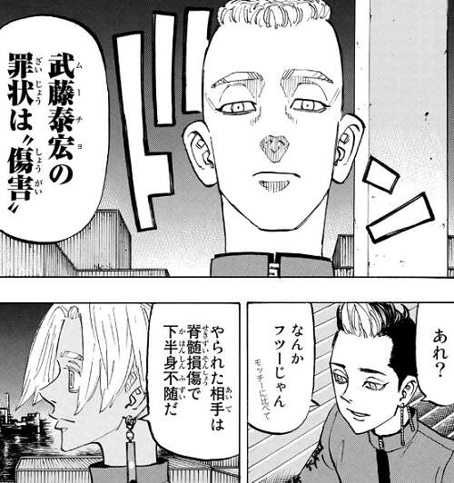 鶴蝶に挑む武道ですが、鶴蝶には歯が立たず稀咲の所まで辿り着けずにいます。他の東卍メンバーも天竺の幹部相手に苦戦していて武道の手助けを出来ずにいます。天竺の極悪の世代とイザナは少年院で出会っていて、極悪の世代はそれぞれ凶悪な事件を犯して少年院に入れられていました。イザナは極悪の世代が揃った天竺に、東卍なんてどう足掻いたところで無駄、天竺の勝ちだ、と勝利宣言します。