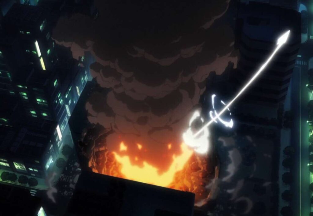 ダミービーコンのトリオンが切れるまでの数分間は東隊が圧倒的に優位ですが、三雲は雨取に焼き出し用のメテオラを使ってショッピングモールに穴を開けるように指示します。雨取のトリオン量でのメテオラは予想以上の破壊力で、ショッピングモールを半壊させてダミービーコンを半分くらい減らしますが、大爆発に奥寺が巻き込まれてベイルアウトし、玉狛第2は追加点を獲得します。