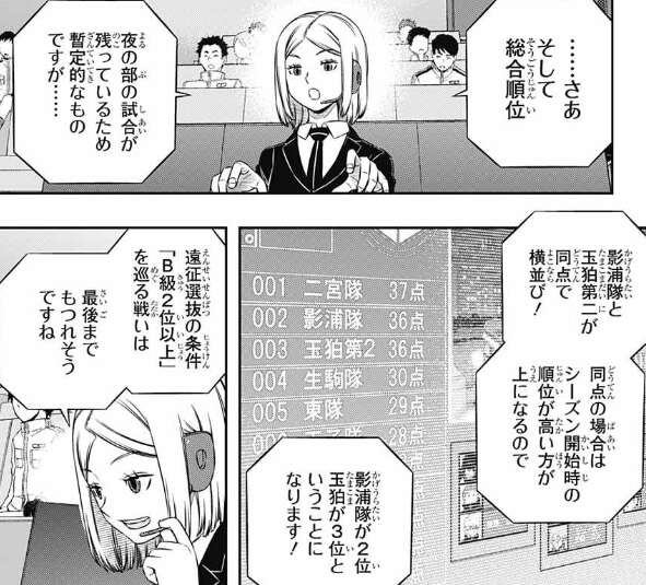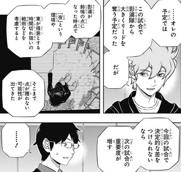 試合後、三雲からバイパーを使わなかった理由をヒュースに聞きますが、この試合で大量得点を狙っていたようです。しかし、影浦隊からそこまで点が取れない可能性出た時点で、次の試合の重要性が増したので余計な手札を晒したくなかったのが理由でした。三雲はあの試合の中で既に次の事を考えていた、ヒュースに改めて感心します。