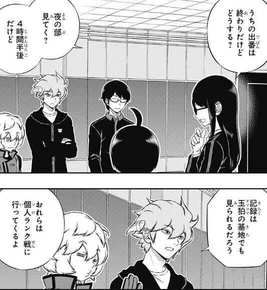 B級ランク戦 ROUND7で大量得点を獲得した玉狛第2は、次の試合に備えて各々備えますが夜の部は見ずに、個人ランク戦や別の用事でいったん解散します。