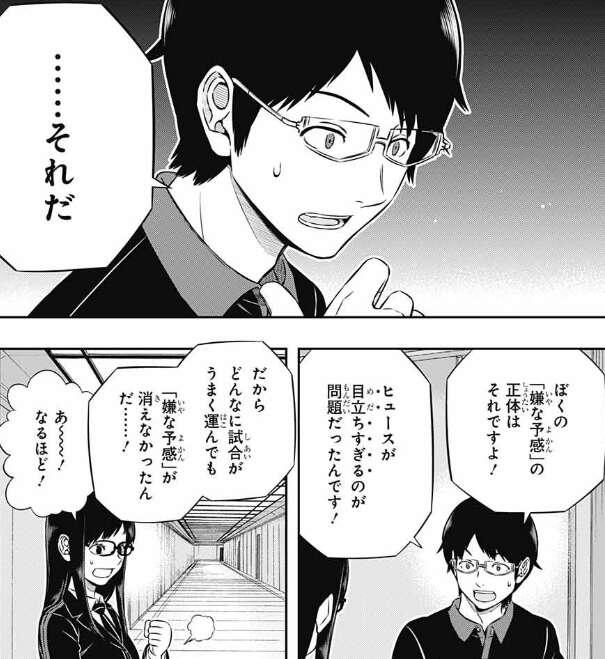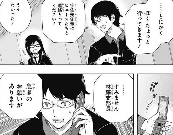 宇佐美は三雲とヒュースの意見の対立時にあとあとモメるかもしれない、と思っていてそれが嫌な予感に繋がると感じていましたが試合後の話し合いでも特に不満を感じなかったので、宇佐美もイヤな予感が分かりません。そこに菊地原から勝利を祝うメッセージが来て、三雲はこの件に関して質問してみます。しかし、菊地原からもこれという回答はなく悩みはそのままです。