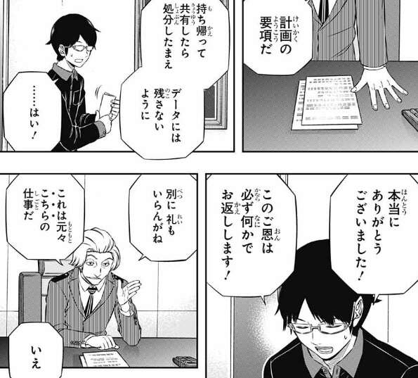 三雲は根付からボーダー本部が考えたヒュースの「設定」計画の要項をもらい、玉狛支部で共有するように言われ、根付に礼を言い資料を受け取ります。根付は礼はいらないと言いますが、三雲は自分の隊員のトラブルは指示を出した隊長のミスだと言い、相変わらず「面倒見の鬼」です。