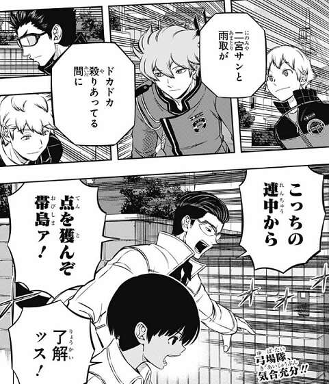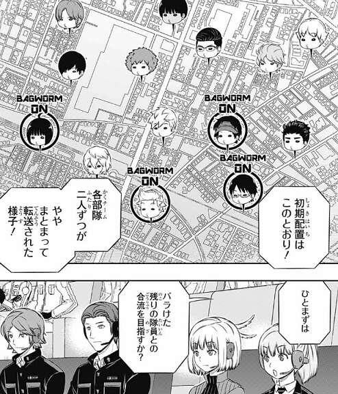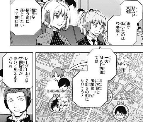 空閑とバッグワームを装備した雨取を確認した二宮隊は、雨取が撃てるのかどうかまずは確認する方針のようで、辻に空閑の相手を、犬飼にMAP東側の盤面を抑えるように指示します。