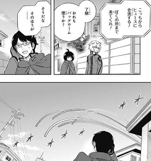 空閑は雨取が緊張している事をサイドエフェクト察したのか、三雲に一発だけハウンドを撃って二宮隊の足を止めた後、バッグワームに切り替えて逃げることを提案します。