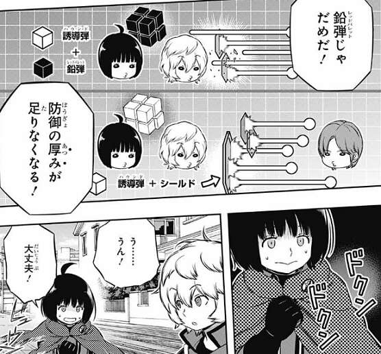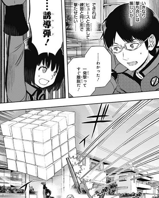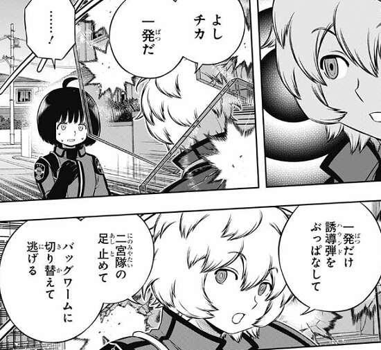 三雲もいきなり撃ち合いは厳しいと判断して、ハウンドを一発撃ってすぐに離脱する事を選択します、三雲は雨取に指示を出し雨取がハウンドを使用すると、特大のでかい弾が現れ二宮隊の二宮と辻を攻撃、追尾します。