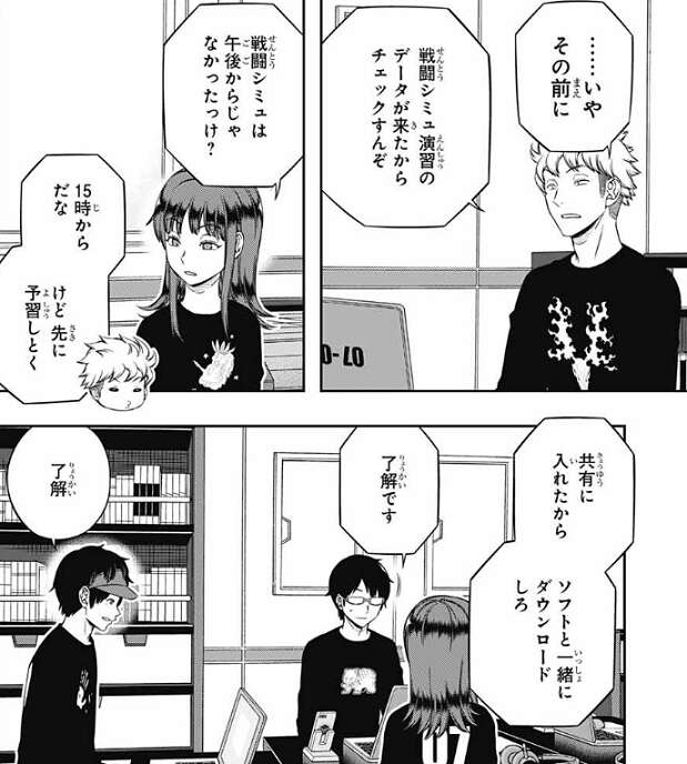 諏訪は、明日から始まる『戦闘シミュ演習』のルールをチェックしたか?と、三雲に確認します。三雲は隠岐のパソコンで確認したと言い、他所の部隊と1対1で勝負して、総当たりなので1日10試合やる感じですよね、と答えます。